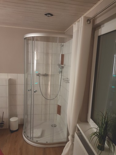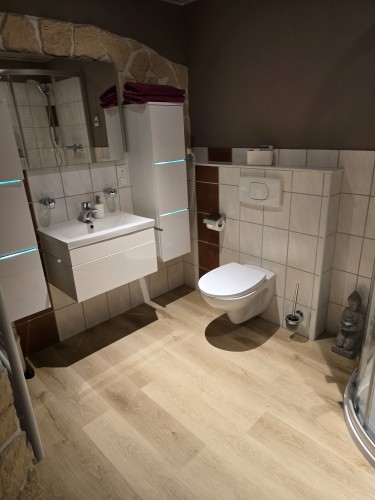 einer Dusche, WC und Waschbecken bietet es jede Menge Stauraum für Ihre persönlichen Pflegeutensilien.
